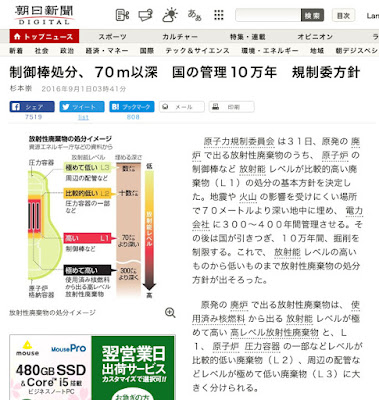 原子力規制委員会は8月31日、原発の廃炉で出る放射性廃棄物のうち、原子炉の制御棒など放射能レベルが比較的高い廃棄物(L1)の処分の基本方針を決定した。地震や火山の影響を受けにくい場所で70メートルより深い地中に埋め、電力会社に300〜400年間管理させる。その後は国が引きつぎ、10万年間、掘削を制限する。これで、放射能レベルの高いものから低いものまで放射性廃棄物の処分方針が出そろった。